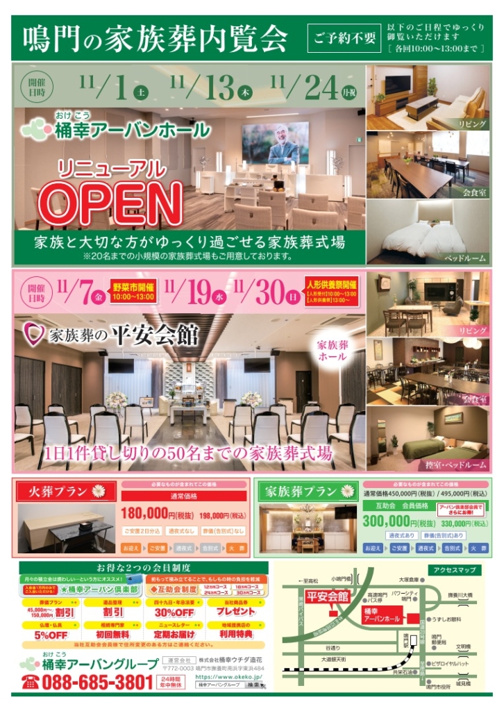 また、11/1(土)・11/13(木)・11/24(祝・月)は桶幸アーバンホールにて、11/7(金)・11/19(水)・11/30(日)は平安会館にて内覧会を行います。