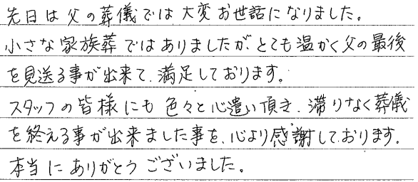 平安会館の皆様こんなにきれいな人だったんだ、こんなに背が高かったんだ、最後の日に知ることができました。化粧の方に、すべてを整えていただき、さっそうと背を伸ばし、おとうとは旅立ってゆきました。お手伝いくださった平安会館の皆様のおかげです。出棺のおりに、当日の朝に思いついた「いい日旅立ち」の曲を流してもらい、コンサートに何度もいくほど谷村新司が好きだった本人は満足だったはずです。わがままにも流していただいた曲でした。担当の方のお手煩わせになりましたが、みおくる私共にとっては思いがこみあげてくるものでした。「…母の背中で聞いた歌を道連れに」「…砂に枯れ木で書くつもり『さよなら』と」……