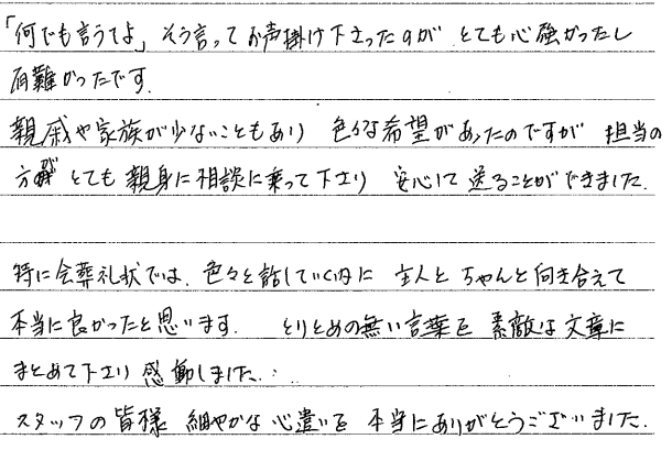 親戚や家族が少ないこともあり 色々な希望があったのですが 担当の方がとても親身に相談に乗って下さり 安心して送ることができました。
