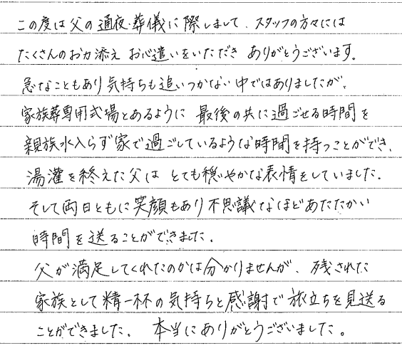 この度は父の通夜・葬儀に際しまして、スタッフの方々にはたくさんのお力添えお心遣いをいただきありがとうございます。