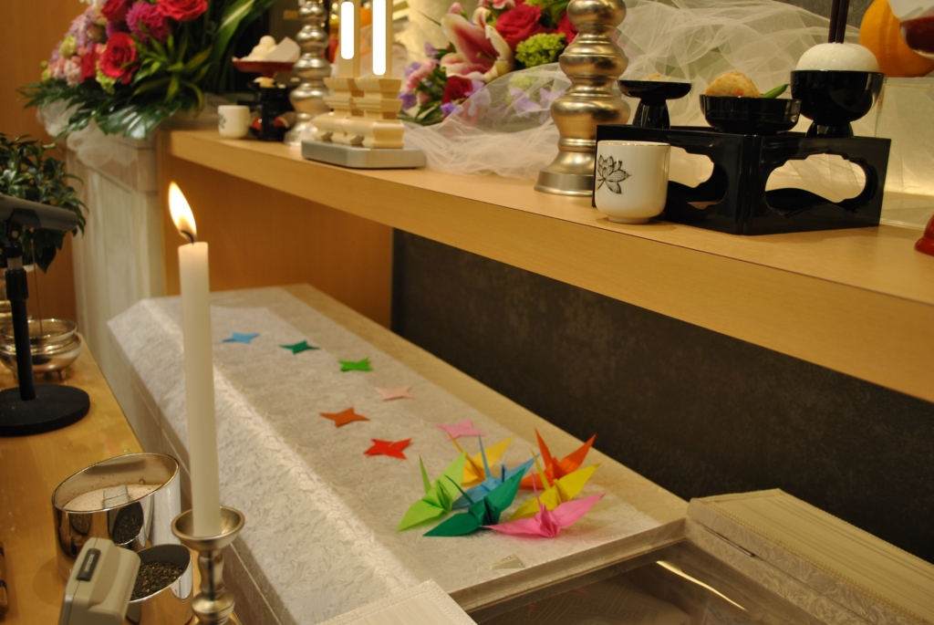 お父様のお好きな食べ物や品物をご用意され、お孫様が折られた折り鶴と共に笑顔でお棺に納められている様子から、ご家族の故人様への想いを感じておりました。