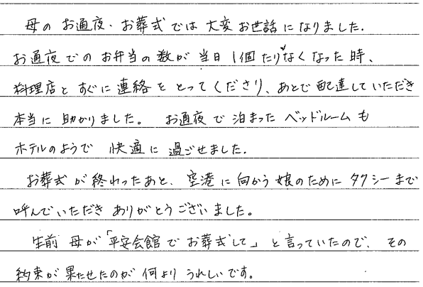 滋賀県 K・K様 2025年11月7日 母のお通夜・お葬式では大変お世話になりました。お通夜でのお弁当の数が当日1個たりなくなった時、料理店をすぐに連絡をとってくださり、あとで配達していただき本当に助かりました。お通夜で泊まったベッドルームもホテルのようで快適に過ごせました。お葬式が終ったあと、空港に向かう娘のためにタクシーまで呼んでいただきありがとうございました。生前母が「平安会館でお葬式して」と言っていたので、その約束が果たせたのが何よりうれしいです。